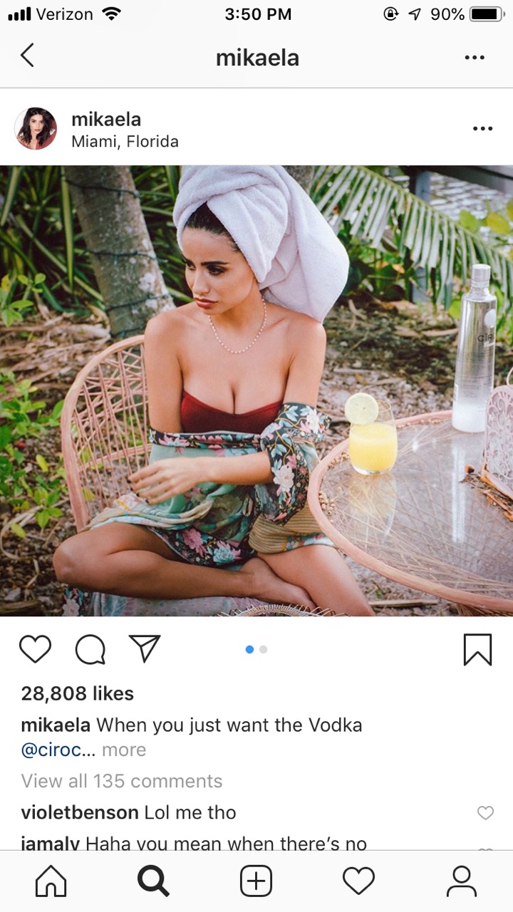 A TINA.org investigation has amassed more than 1,700 Instagram posts from 50 different Ciroc influencers that have failed to clearly and conspicuously reveal their material connection to the alcohol brand in violation of FTC law. More than a third of these posts come from Diddy, while others come from Ciroc influencers “hand-selected” by Diddy. Included in this group is “Guardians of the Galaxy” actress Mikaela Hoover, who posted the following Ciroc ad on Instagram earlier this year.